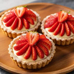 Corta las fresas en láminas y decora las tartaletas. Puedes darles un toque de brillo si lo deseas.