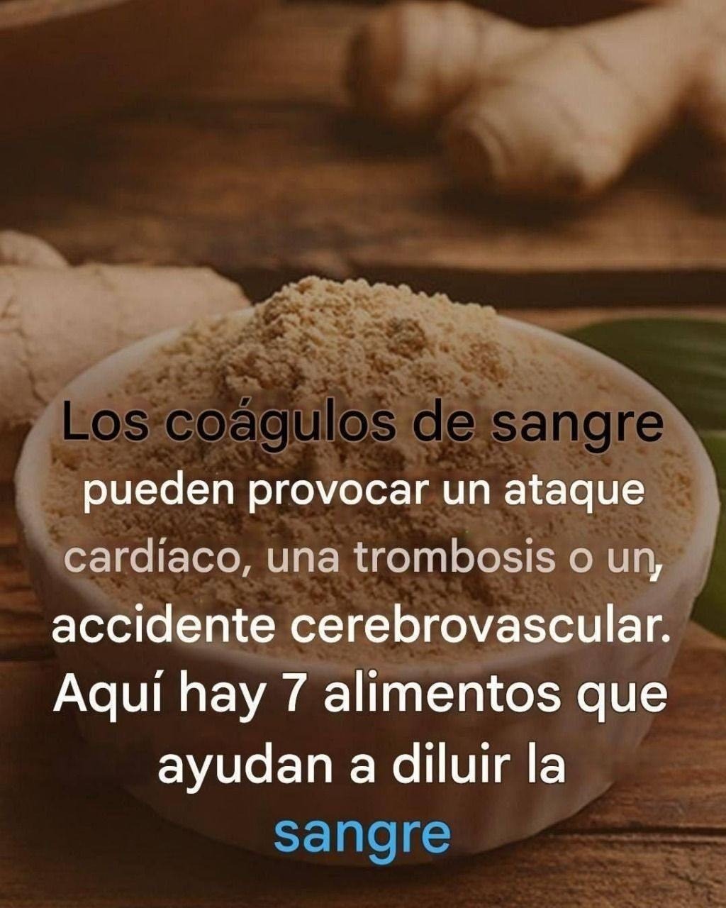 Peut être une image de texte qui dit ’pueden provocar un ataque cardíaco, una trombosis o un, accidente cerebrovascular. Aquí hay 7 alimentos que ayudan a a diluir la sangre’